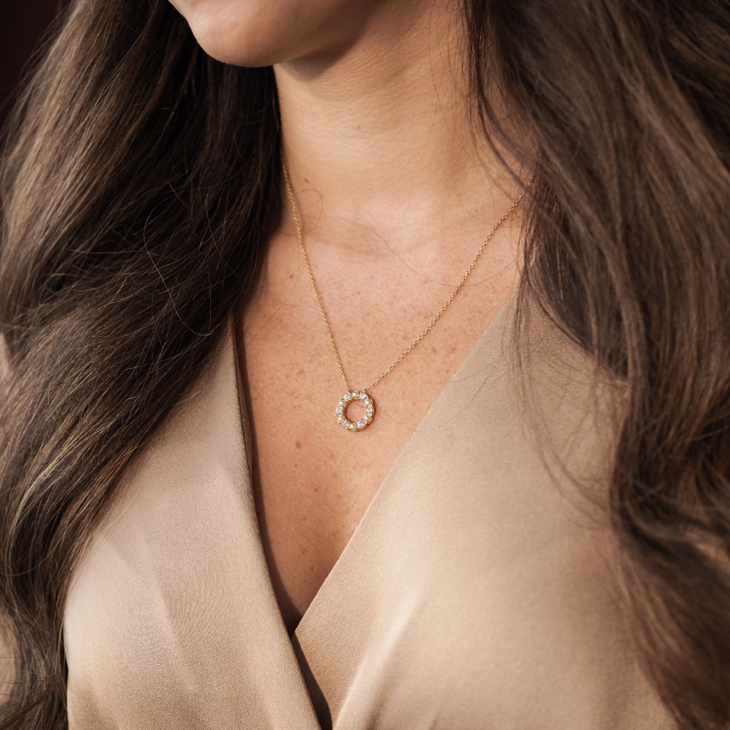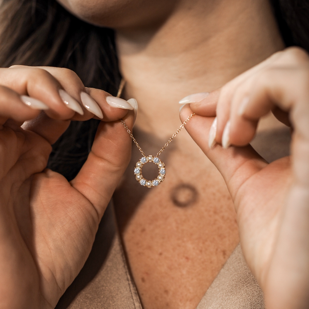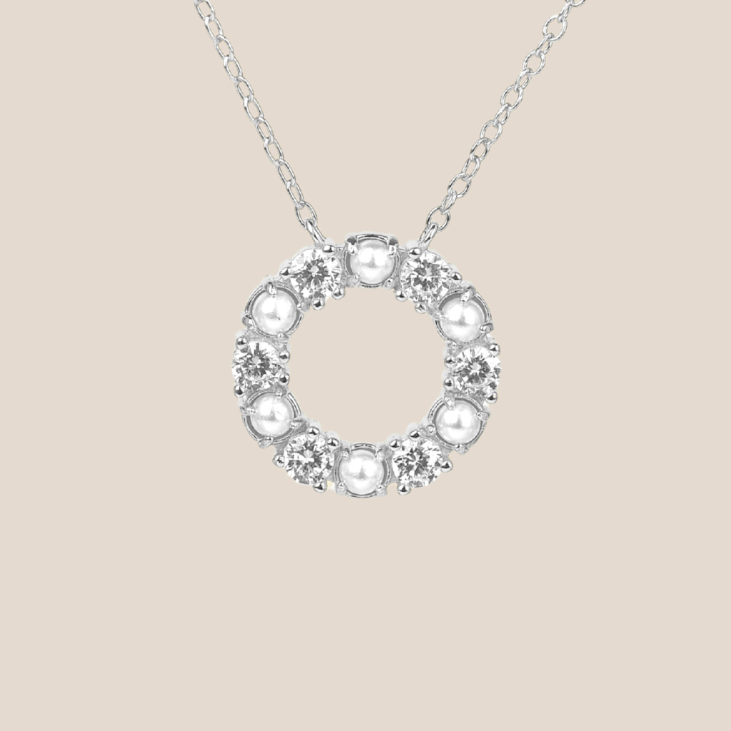 Přívěsek náhrdelníku má vnější průměr 15 mm a je ozdoben šesti syntetickými perlami o průměru 2,5 mm a šesti zirkony o velikosti 3 mm.