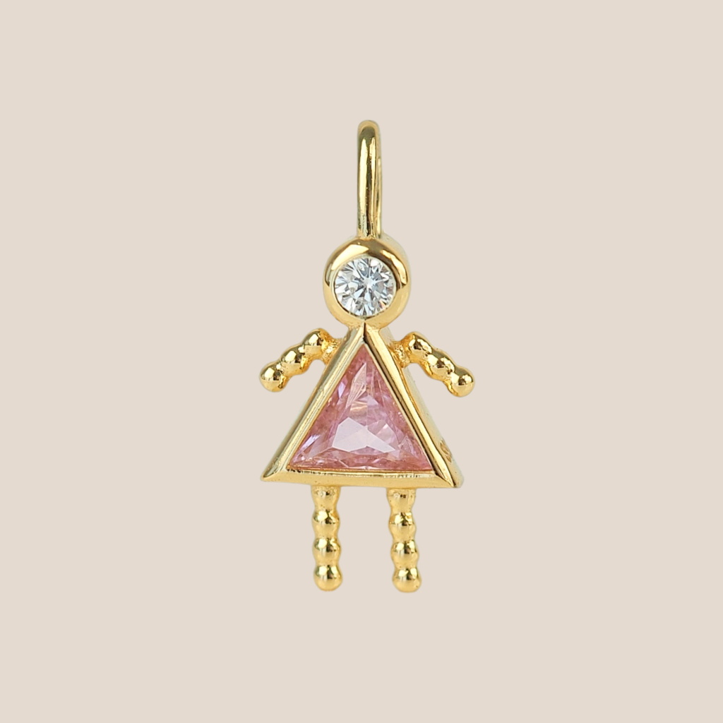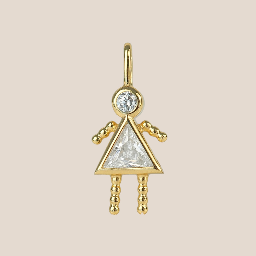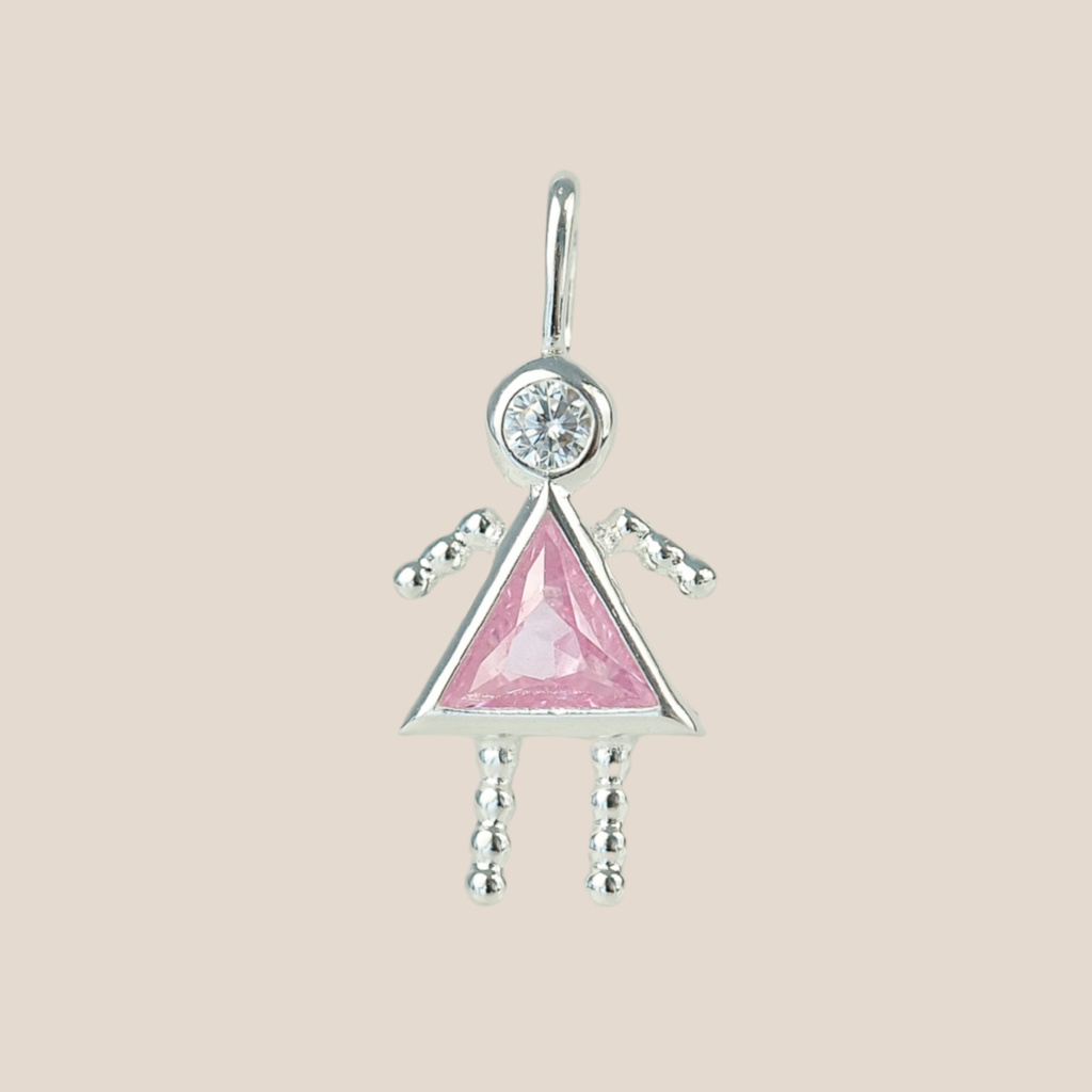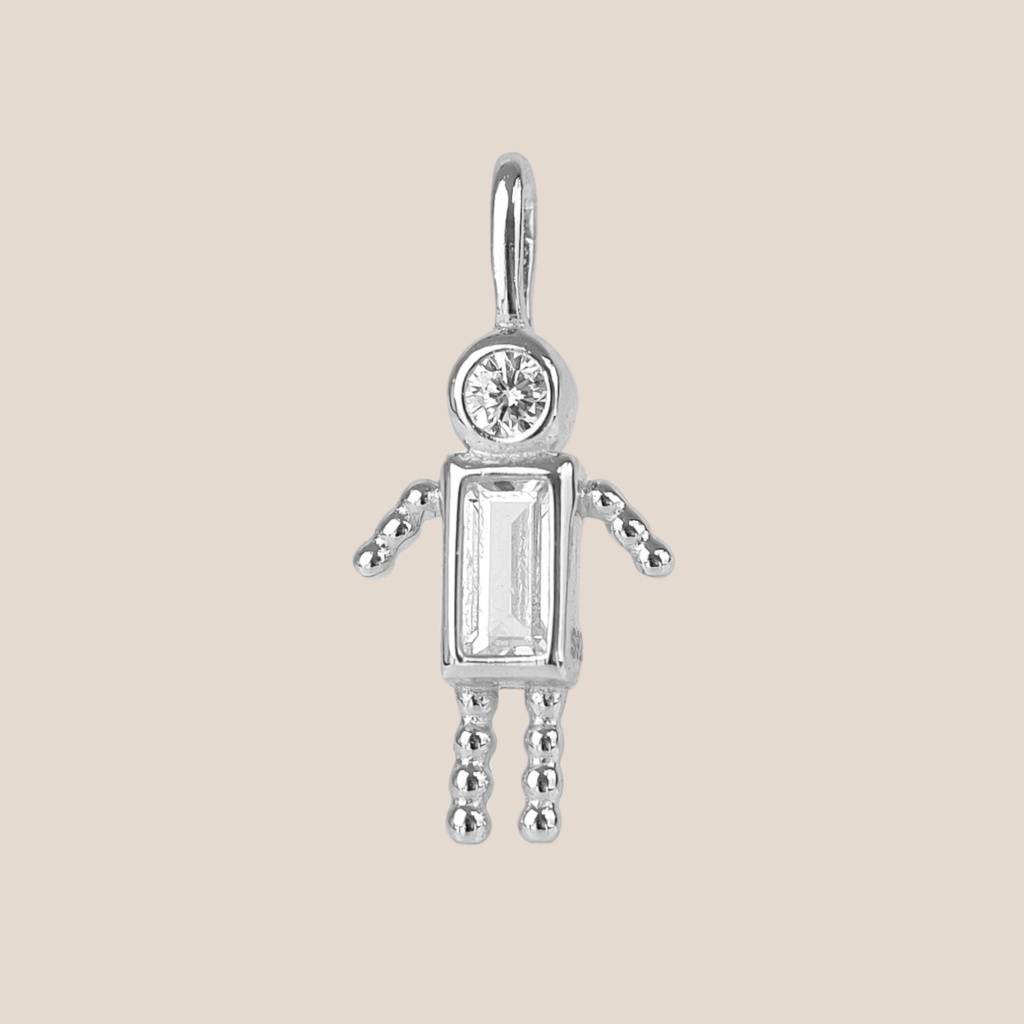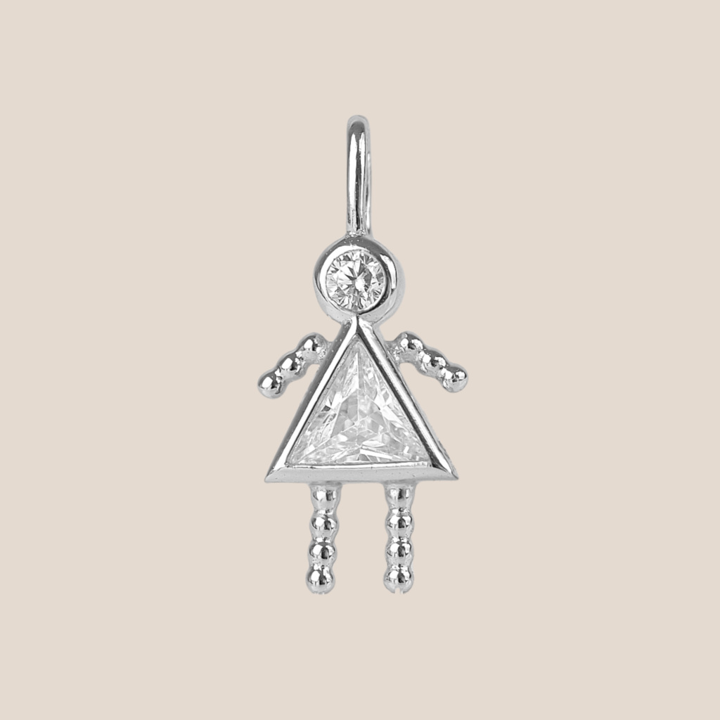 Přívěsek je velký 11 mm na výšku a 6 mm na šířku a je zdoben dvěma zirkony.