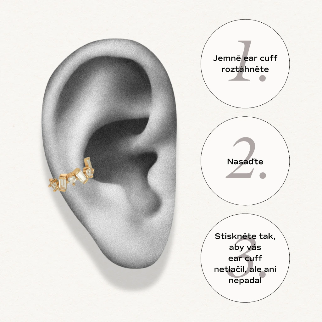 Jak Ear Cuff nosit? Ear cuff je nasazovací náušnice, která krásně dozdobí váš outfit a to bez propíchnutého ucha! Ear cuff stačí lehce roztáhnout, a umístit do horní nebo středové části ucha a opět lehce přimáčknout. Pokud ear cuff správně upevníte, bude vám krásně držet celý den.