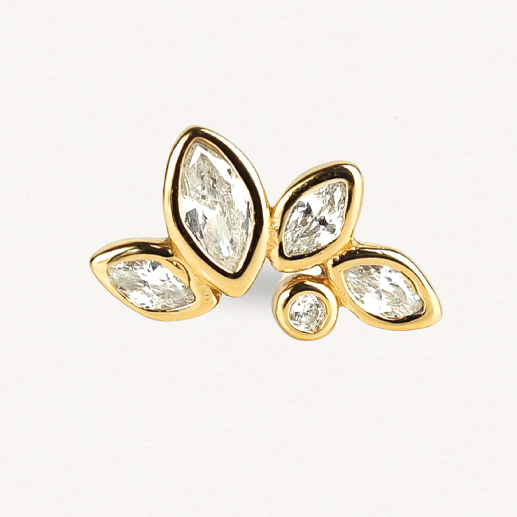 Ozdobná část náušnice má rozměr 6 × 10 mm a je zdobena pěti zirkony. Délka tyčinky je 10 mm.