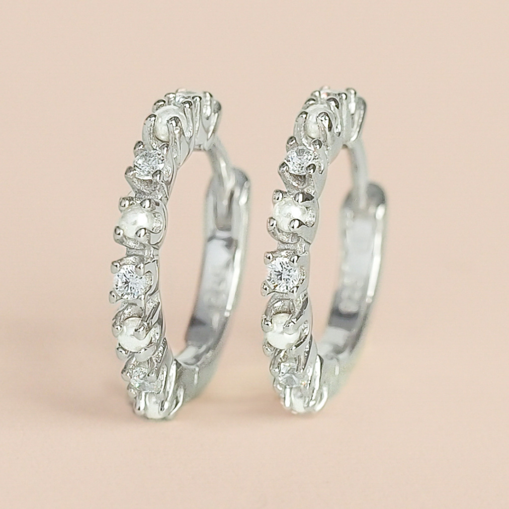 Náušnice jsou posázené 1,5 mm syntetickými perličkami a zirkony. Kroužky mají vnitřní průměr 10 mm a vnější 14 mm.