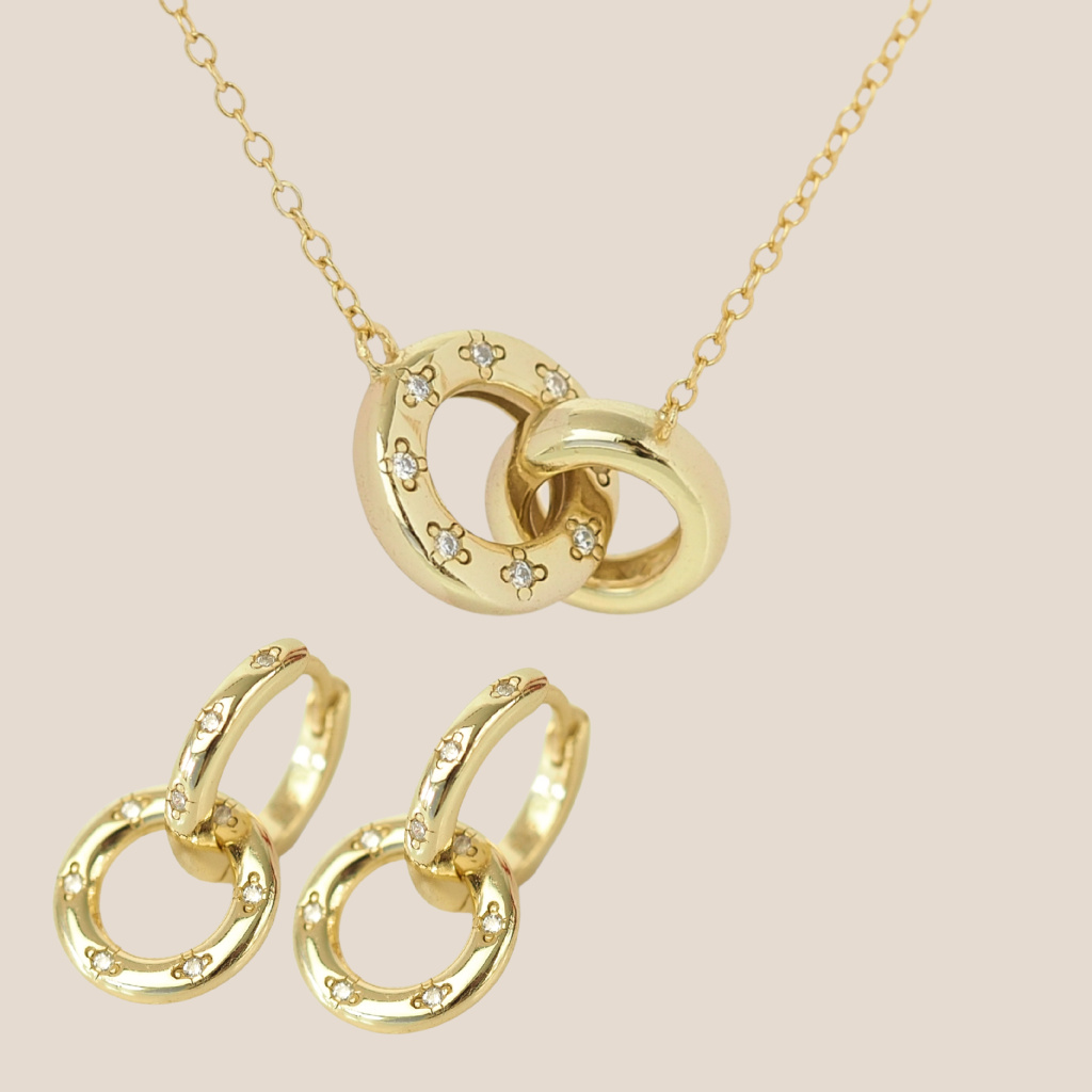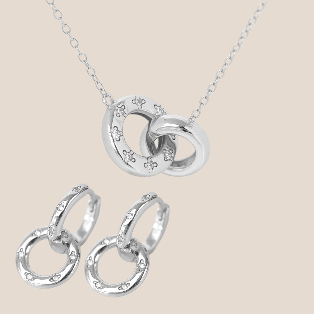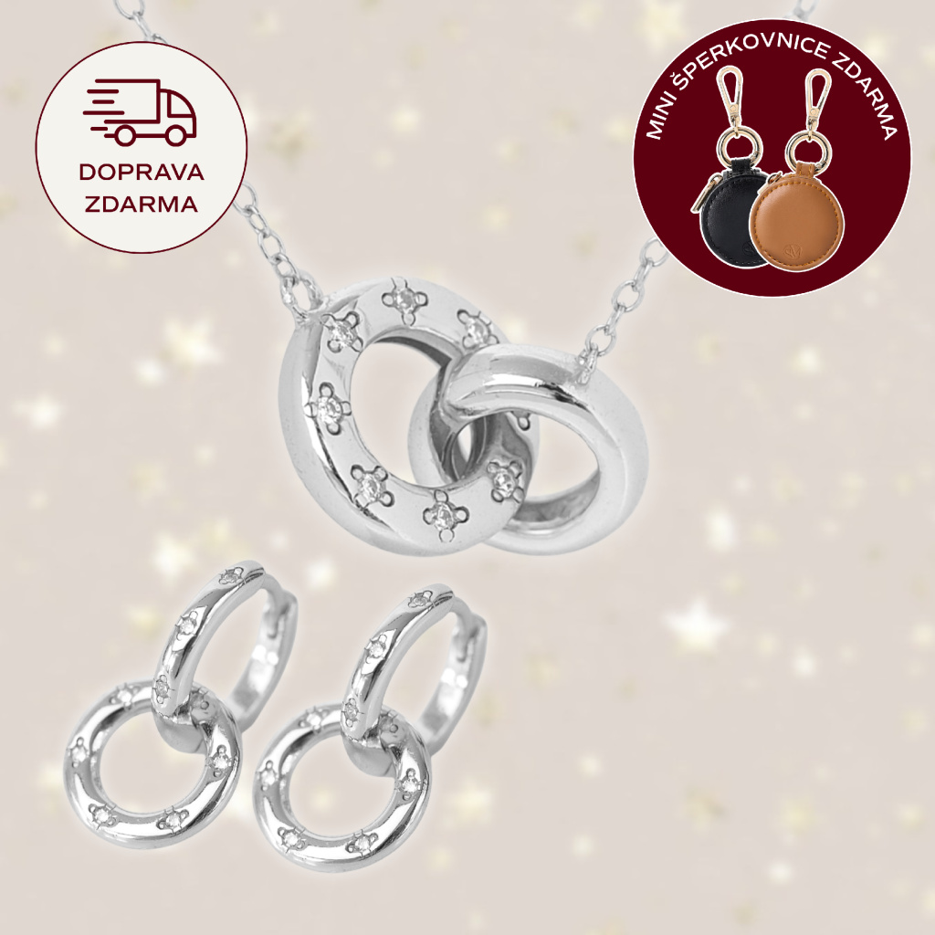 Sada kombinuje náhrdelník se dvěma jemnými kruhy (11 a 10 mm), z nichž větší zdobí osm drobných zirkonů. Náušnice tvoří dvojitý kroužek o průměrech 12 a 10 mm, ozdobený devíti zirkony o velikosti 1 mm.