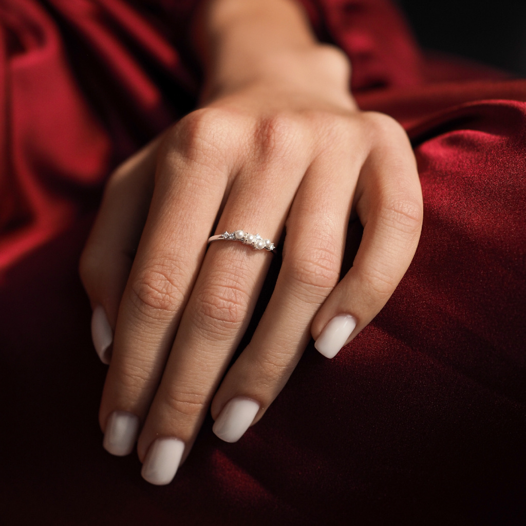 Prstýnek je ozdoben čtyřmi syntetickými perličkami o průměru 2 mm a čtyřmi drobnými zirkony o velikosti 1 mm. Ozdobná část prstýnku je široká 5 mm a dlouhá 15 mm, šířka obroučky je 1 mm.